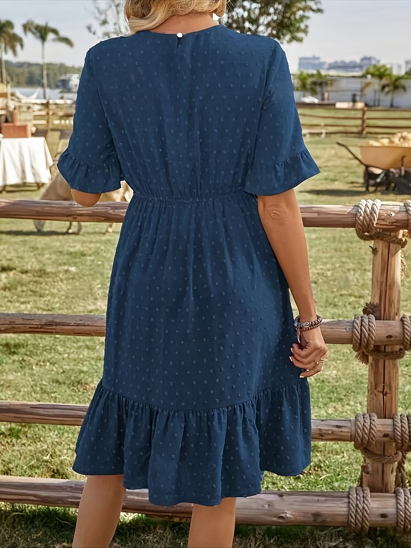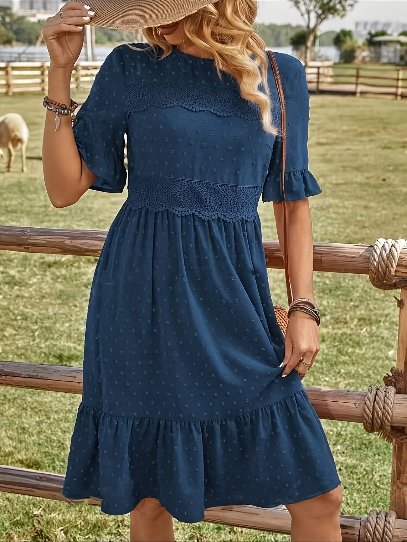 Elegant Navy Dot Lace-trim A-Line Dress mixes playful dot texture and delicate lace trim to bring a romantic yet fresh look. The dress features short sleeves, crew neckline, and a thigh-length A-line cut which flatters many body types. Lightweight and breathable — perfect for warm spring or summer days — yet gives a polished vibe for casual meetups or dressier outings. Comfortable without sacrificing style, this piece transitions effortlessly from daytime errands to evening plans.