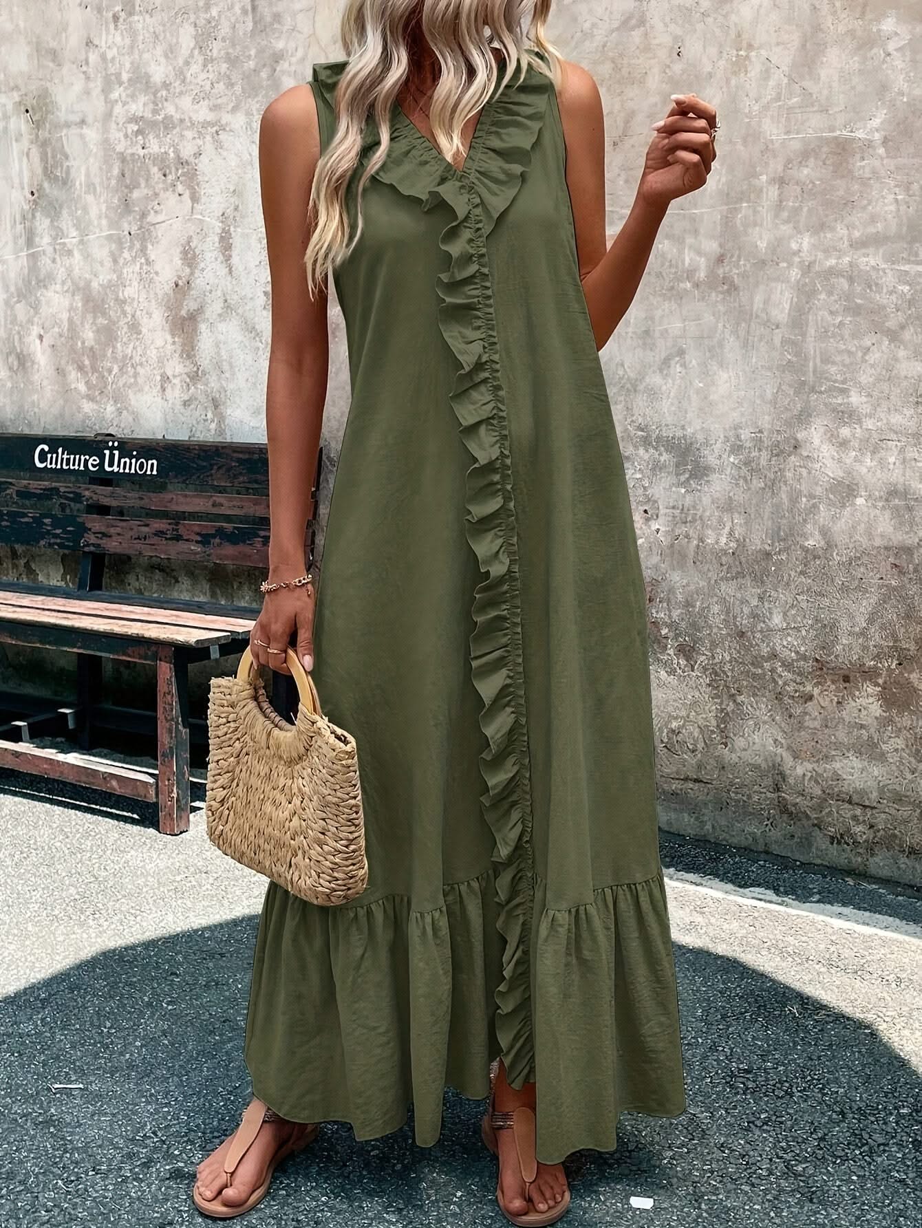 The Liora – Sleeveless Ruffle Hem Maxi Dress combines effortless elegance with comfort for spring and summer. Its flattering V-neckline and sleeveless design make it ideal for warm weather, while the ruffle hem adds a playful, feminine touch. Crafted from lightweight polyester, this dress flows gracefully for casual outings, garden parties, or vacation events. Its solid green color offers versatile styling options for any occasion.