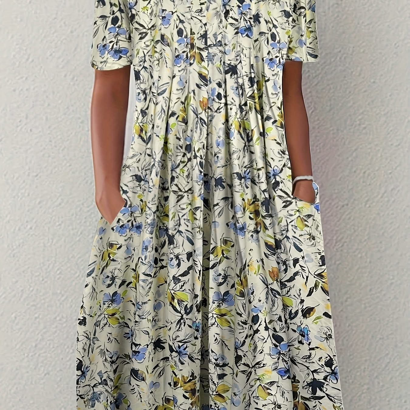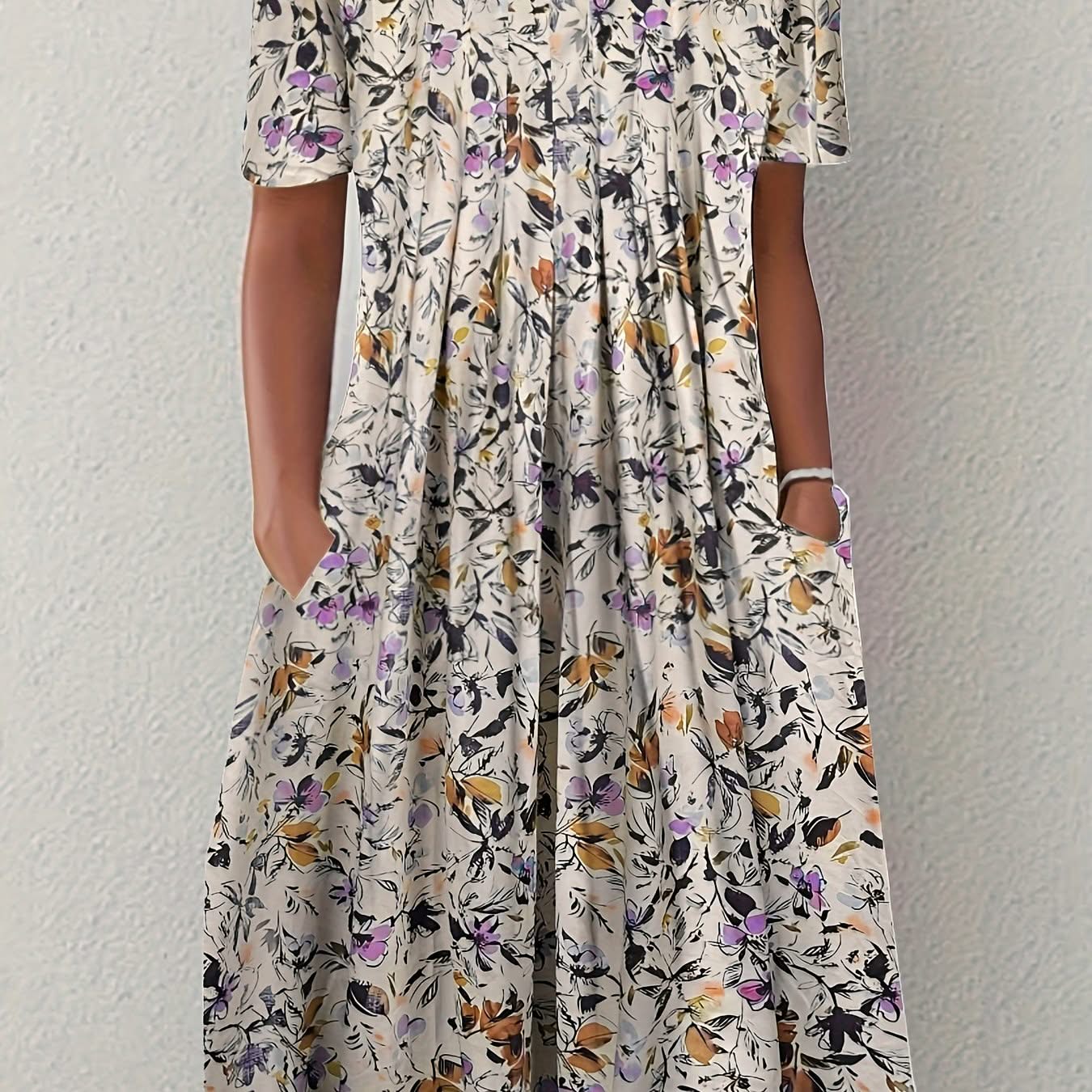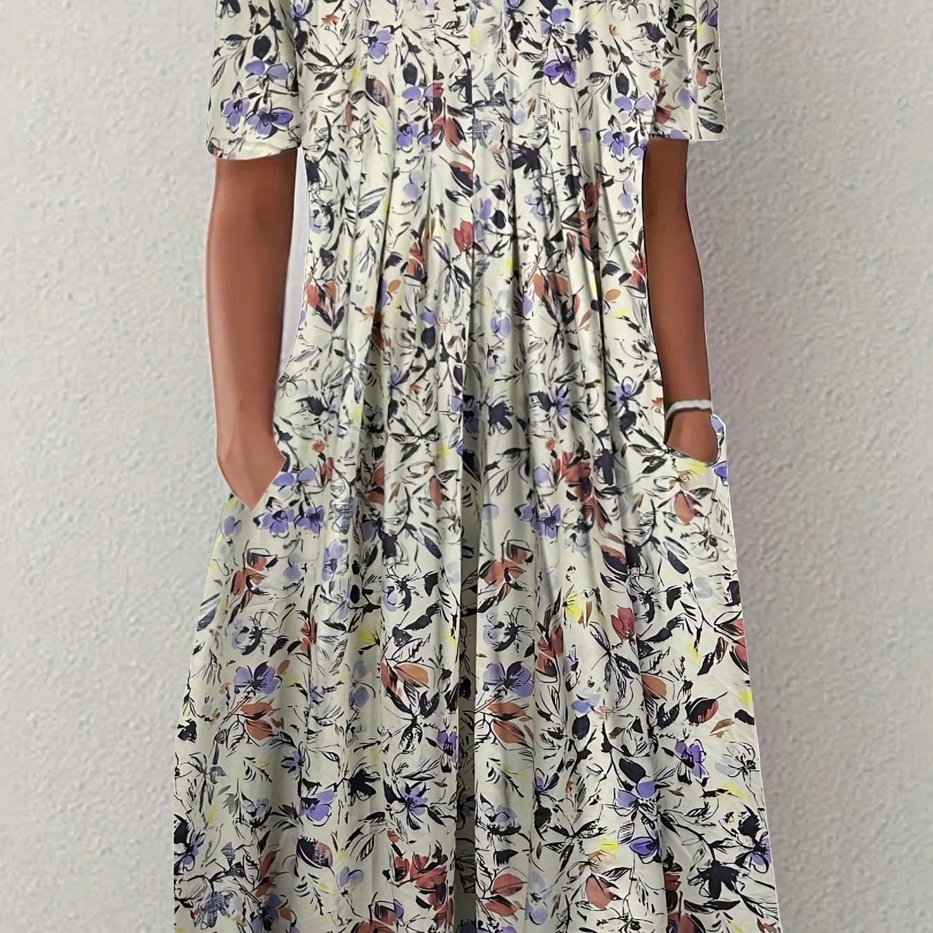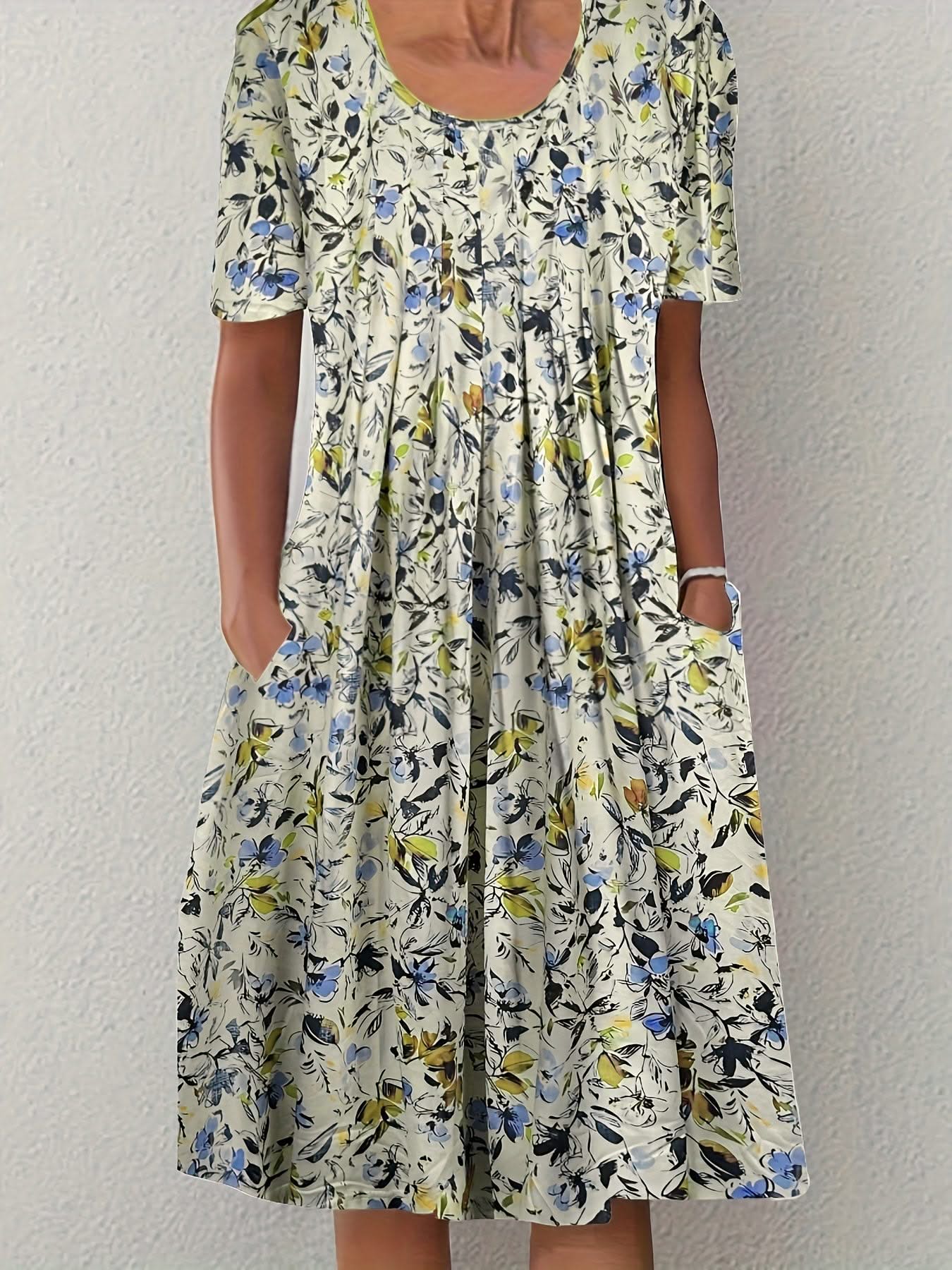 Flora – Pleated Floral Print Plus-Size Dress offers a harmonious blend of comfort and style. The random floral print adds a touch of whimsy, while the pleated design provides a flattering silhouette. With short sleeves and a round neck, this dress is perfect for casual outings, ensuring you stay cool and chic.