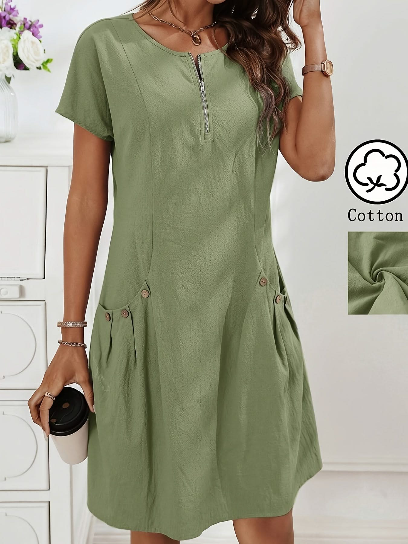 womens casual summer dress with zipper half open button detail double pockets flared skirt olive green round neck short sleeve button detail dress 2
